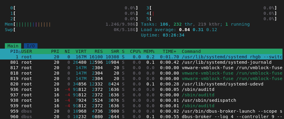 top - 10:06:19 up 34 min, 1 user, load average: 0.08, 0.05, 0.10 Tasks: 343 total, 1 running, 342 sleeping, 0 stopped, 0 zombie %Cpu(s): 0.1 us, 0.7 sy, 0.0 ni, 98.9 id, 0.0 wa, 0.2 hi, 0.1 si, 0.0 st MiB Mem : 10219.9 total, 7878.3 free, 1580.1 used, 1044.2 buff/cache MiB Swap: 5304.0 total, 5304.0 free, 0.0 used. 8639.8 avail Mem PID USER PR NI VIRT RES SHR S %CPU %MEM TIME+ COMMAND 8586 gha-0001 20 0 4449060 203036 114556 S 4.7 1.9 0:08.90 gnome-shell 8384 root 20 0 226132 4348 3364 R 0.3 0.1 0:00.06 top 1 root 20 0 172176 16064 10212 S 0.0 0.2 0:02.16 systemd 2 root 20 0 0 0 0 S 0.0 0.0 0:00.06 kthreadd 3 root 0 -20 0 0 0 I 0.0 0.0 0:00.00 rcu_gp |