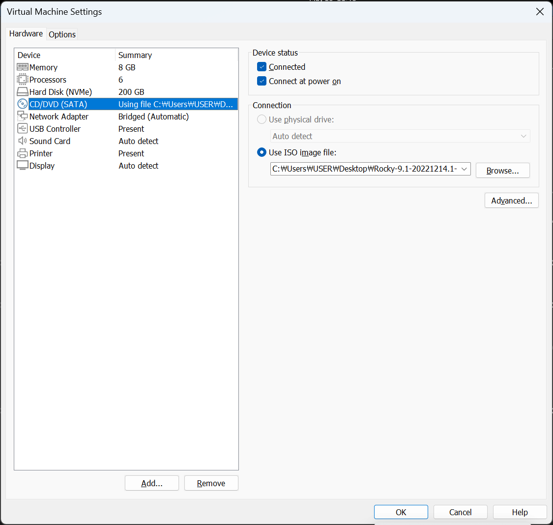 vm웨어 설정에서 iso 파일을 지정