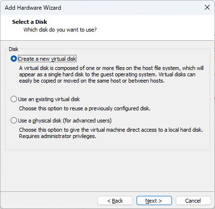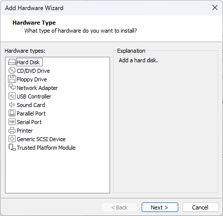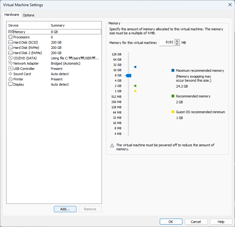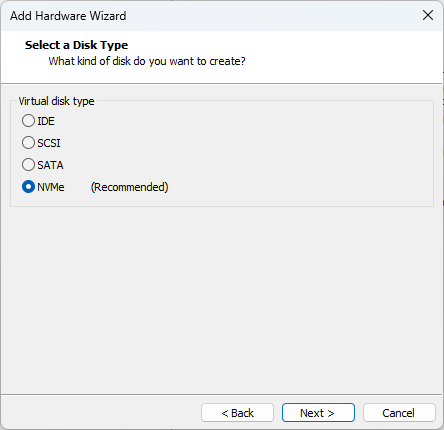 하드디스크 추가, NVMe 선택(디스크를 추가할 가상머신이 종료되어 있어야 함)