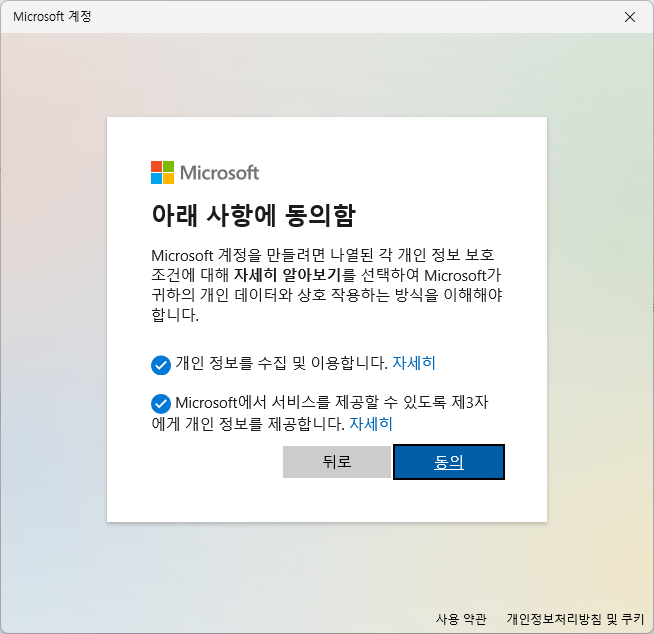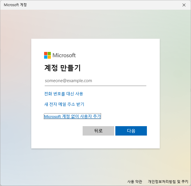 - 동의 후 ‘Microsoft 계정 없이 사용자 추가’ 선택