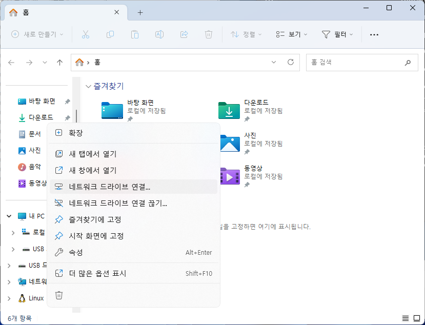 - 파일탐색기에서 네트워크를 우클릭 후 ‘네트워크 드라이브 연결’ 선택