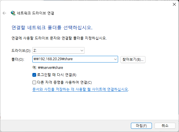 \\[서버의 IP]\[smb.conf에서 설정한 section] 입력하면 연결된다