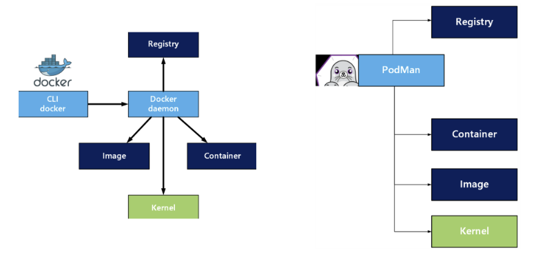 | podman | 단일 바이너리 실행 파일로 구성. 별도의 서버가 필요하지 않고, 컨테이너를 직접 관리. |